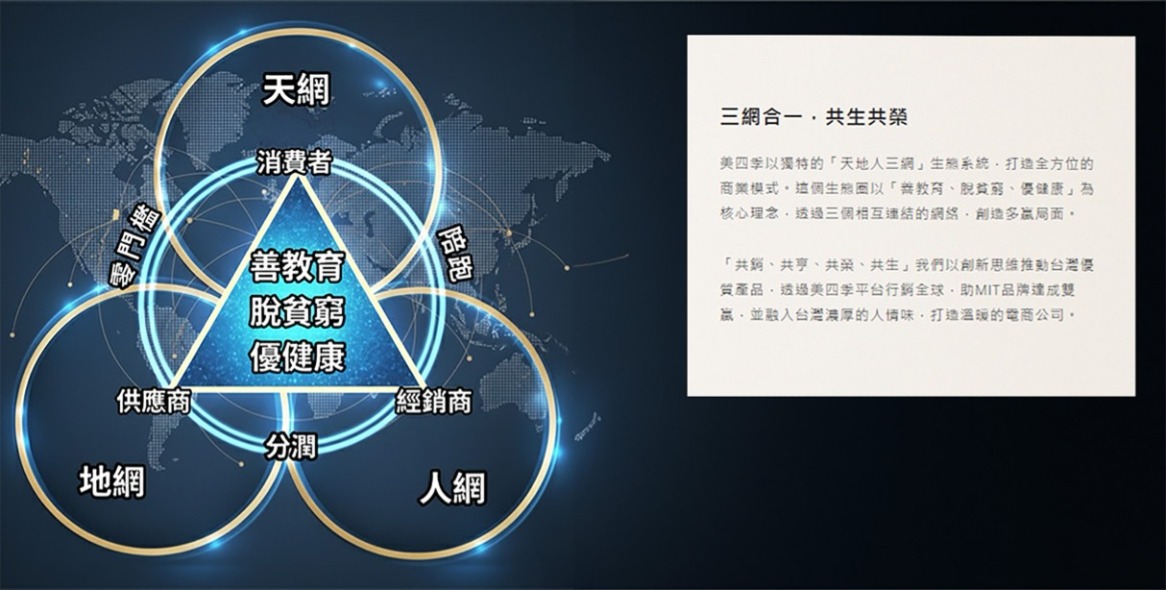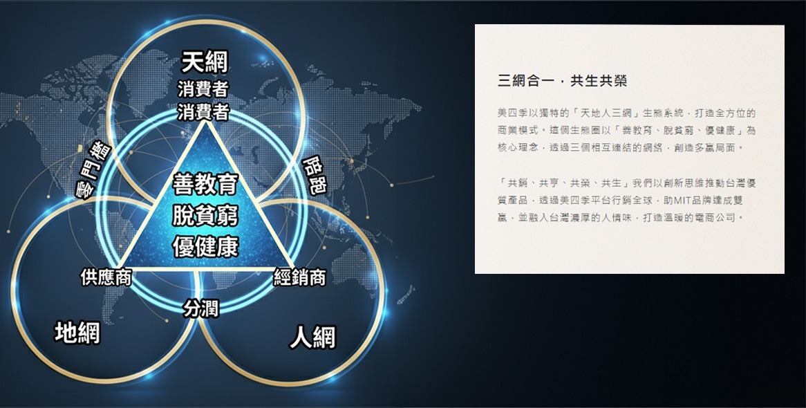 三網合一,共生共榮 美四季以獨特的「天地人三網」生態系統,打造全方位的商業模式。這個生態圈以「善教育、脫貧窮、優健康」為核心理念,透過三個相互連結的網絡,創造多贏局面。 「共銷、共享、共榮、共生」我們以創新思維推動台灣優質產品,透過美四季平台行銷全球,助MIT品牌達成雙贏,並融入台灣濃厚的人情味,打造溫暖的電商公司。 線上平台 只要加入LINE,就可以開始兼職創業, 分享商品連結即可獲得分潤。 立即加入 實體據點 提供25種分潤機制, 不同階級享有不同分潤比例 收入無上限。 點即了解 人際傳播 陪跑教學服務 一步一步教學指導,專人帶領成為經銷商 確保成功。 專人詢問